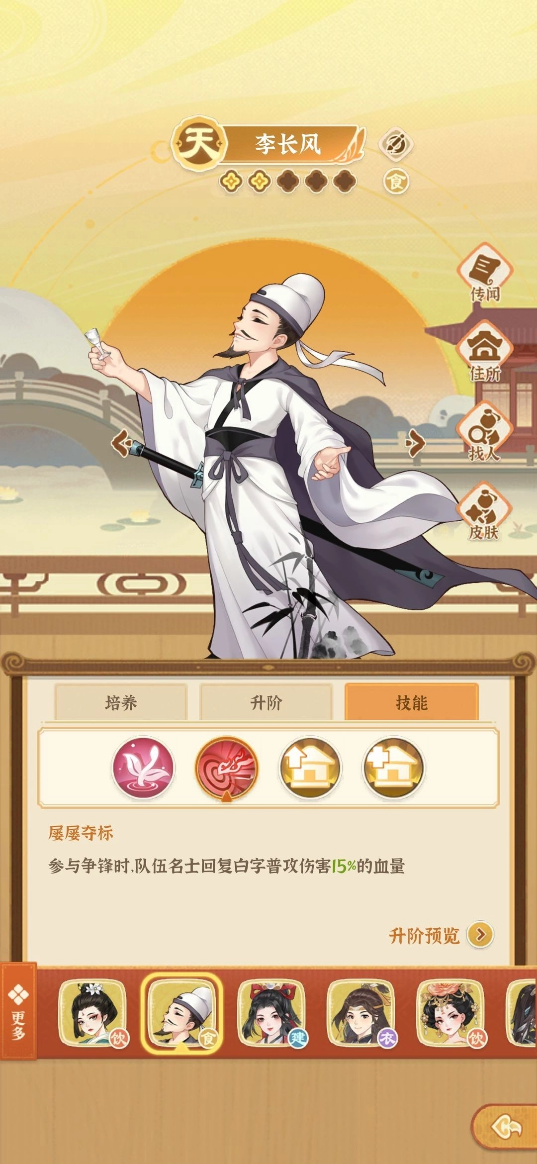 名士技能包含主技能、特殊技能与全局技能(此处以李长风为例)。关于升星加成的具体内容,还请在游戏内进行查看,需要说明的是,所有名士的升星加成百分比是相同的。