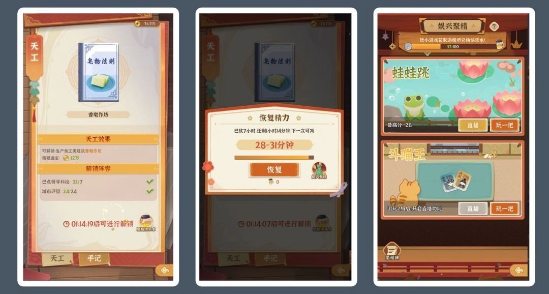 前期系统会赠送吃食店的装修,所以核心要转向“家具”,相关技能研究的优先级最高。同时可以多建2到3个杂货店一起售卖家具,要是家具不够就直接用道具加速生产,争取在短时间内转型成“建材店”。另外,等天工研究完肥皂后,就专门卖肥皂来搭建“日用店”(氪佬建议直接优先选择日用店)。