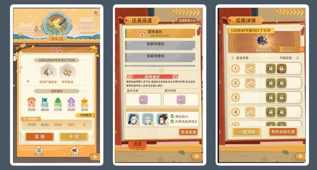 当安全、社区、环境、文娱、商业这五个属性的数值都达到标准后,就能提升民望等级并获取“升级材料”。这些属性可以通过名士、建造装饰类建筑、升级民望相关建筑等途径来获取~