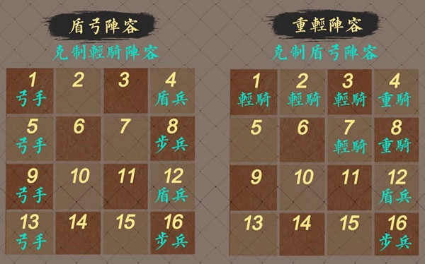 左前方靠前的两列排布着:负责出谋划策的智囊团队、擅长远程射击的弓手编队、行动敏捷的轻骑兵单位以及装备厚重的重骑兵部队。