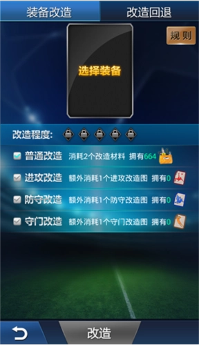 普通改造每次需要消耗2个普通改造材料,材料属性为随机的进攻、防守或守门类型。