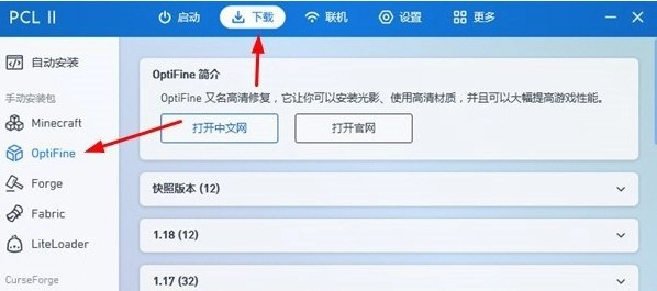 点击pcl启动器上方的【】,挑选【OptiFine】这个光影必备组件,注意要选择和自己游戏版本对应的哦。