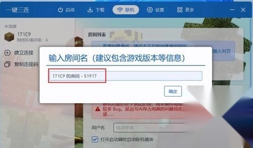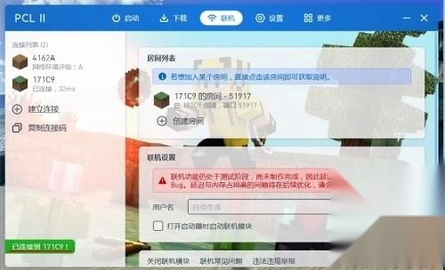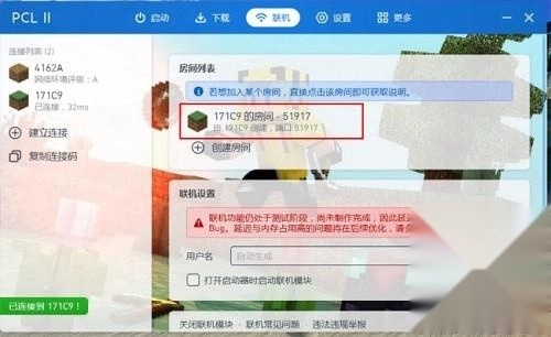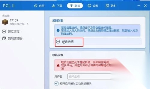 打开PCL2启动器后,点击顶部的联机频道选项,接着点击右侧的【创建房间】按钮。