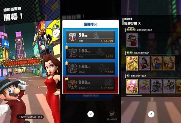 杯赛以四关构成一个赛事单元,设有50cc、100cc、150cc和200cc四个难度等级,还会推出期间限定的活动关卡,通过持续更新保持新鲜感;另外,本集采用抽卡机制来获取角色、车辆与滑翔翼,组合搭配是决定胜负的重要因素,比如不同角色在不同杯赛中会有各异的加成效果,这会直接影响从「?」宝箱中得到的道具数量。