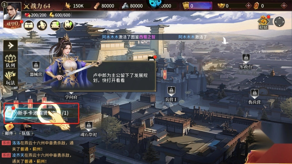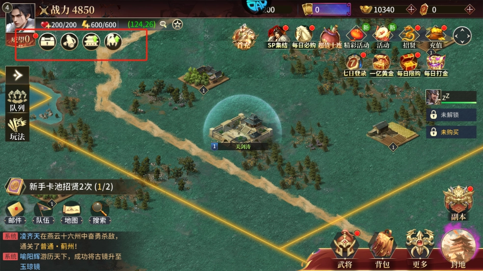 刚进入游戏时,建议玩家把提升主角等级、解锁更多功能作为首要任务。这里推荐大家优先推进主线副本,同时按照主界面的任务指引完成任务,以此获取强力武将和丰厚的任务奖励。