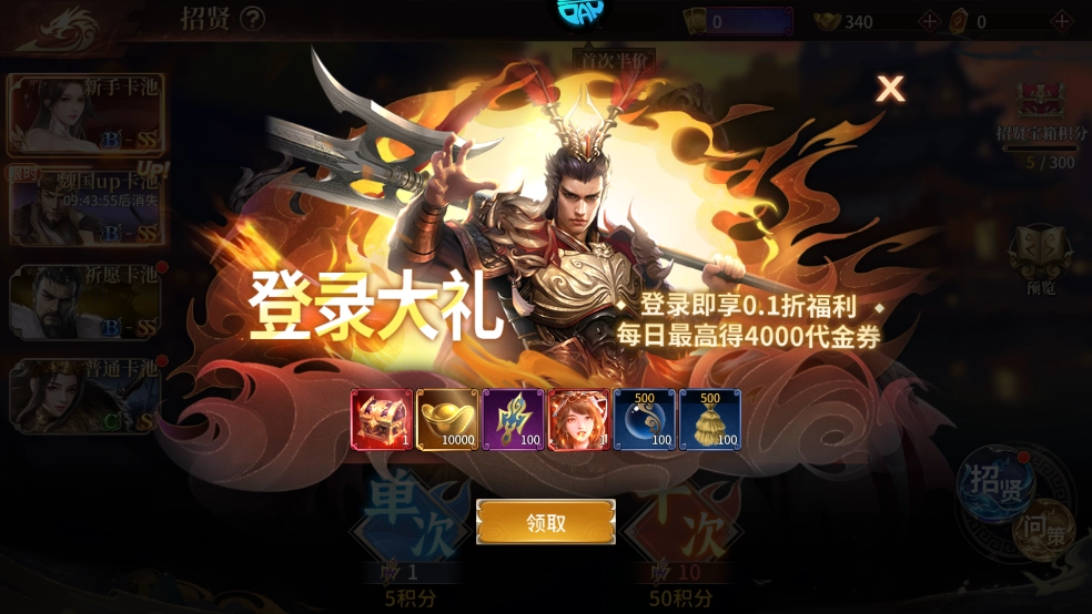 新手参与七日签到活动可领取丰厚奖励,还能从强力SS级角色庞统与华佗中任选其一