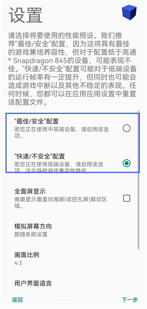 中高端设备可选用【最佳/安全配置】,较低端设备则适合选择【快速/不安全配置】。