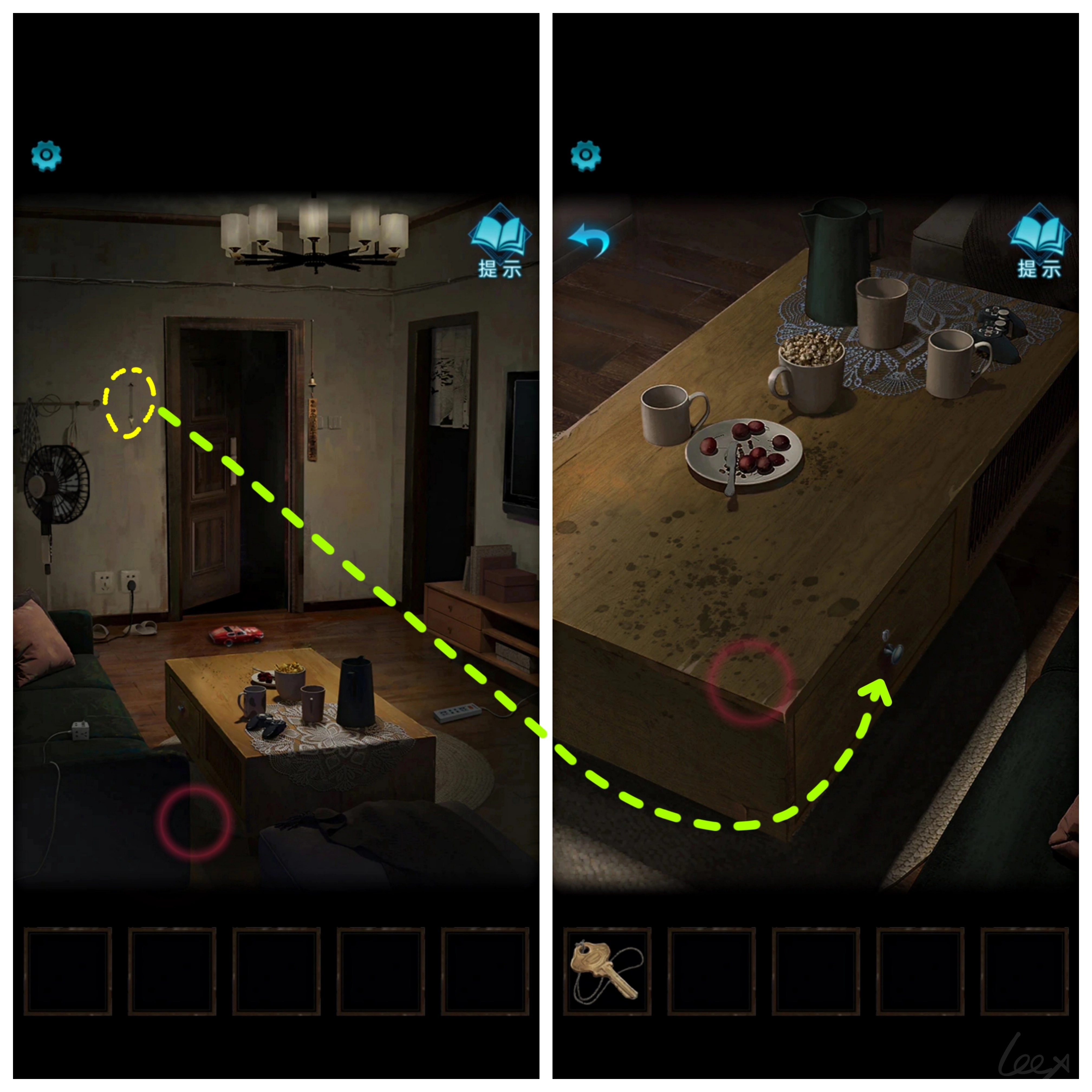 风扇吹动了挂历,让它掉落在地。我在门左侧的墙上找到了一把钥匙,用这把钥匙打开了茶几的抽屉,从里面取出一支玉簪,然后走出了门。