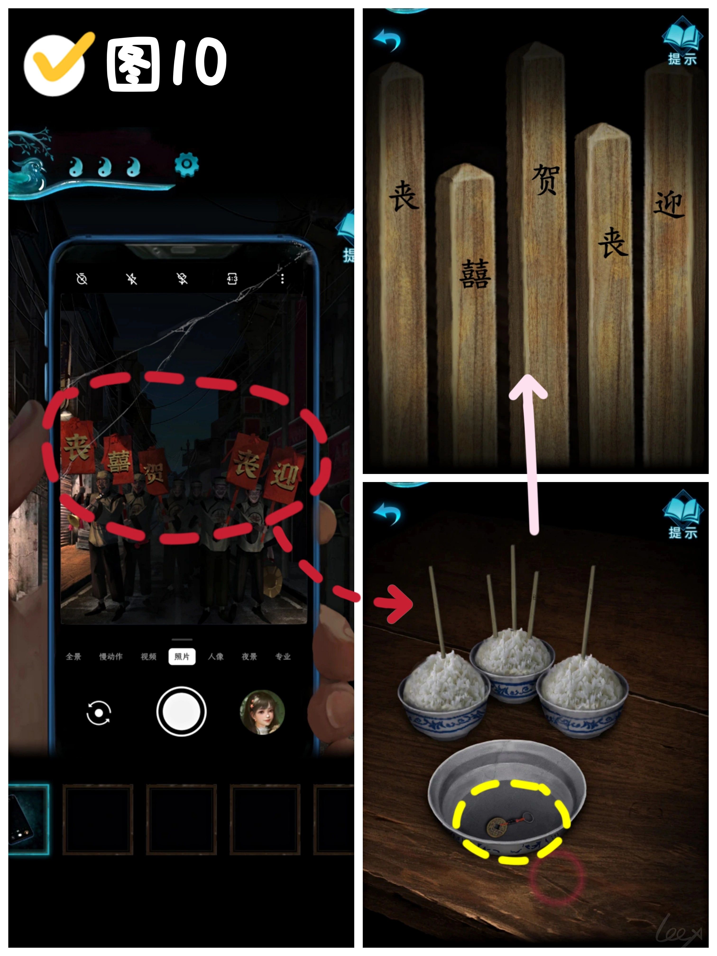 观察纸人手中举着的牌子,上面写着“丧-囍-贺-丧-迎”,接着向右转走到月老所在的位置,点击右侧的桌子,按照纸人举的牌子上的顺序转动米饭上的筷子,等黑汤完全喝完,就能从碗里拿到〔吊坠〕了。(图10)