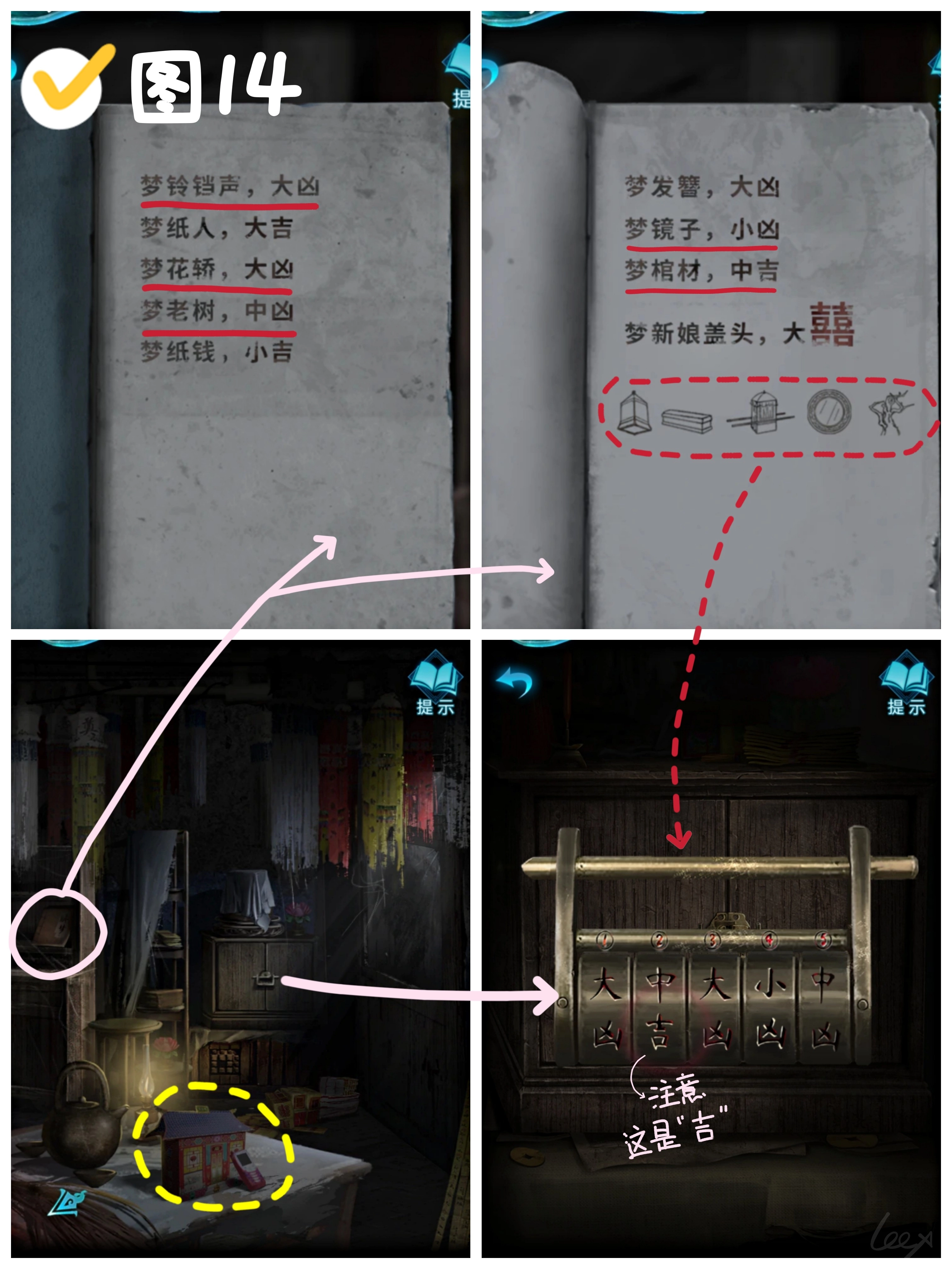 走进易寿堂后,取走桌案上的纸扎手机与纸扎寺庙。查看左侧置物架上的《解梦》一书,依据第二页的图标对照前后页面的吉凶提示,解开右侧立柜的密码——铃铛、棺材、花轿、镜子、老鼠分别对应大凶、中吉、大凶、小凶、中凶,开启柜子即可得到小旗子。(图14)