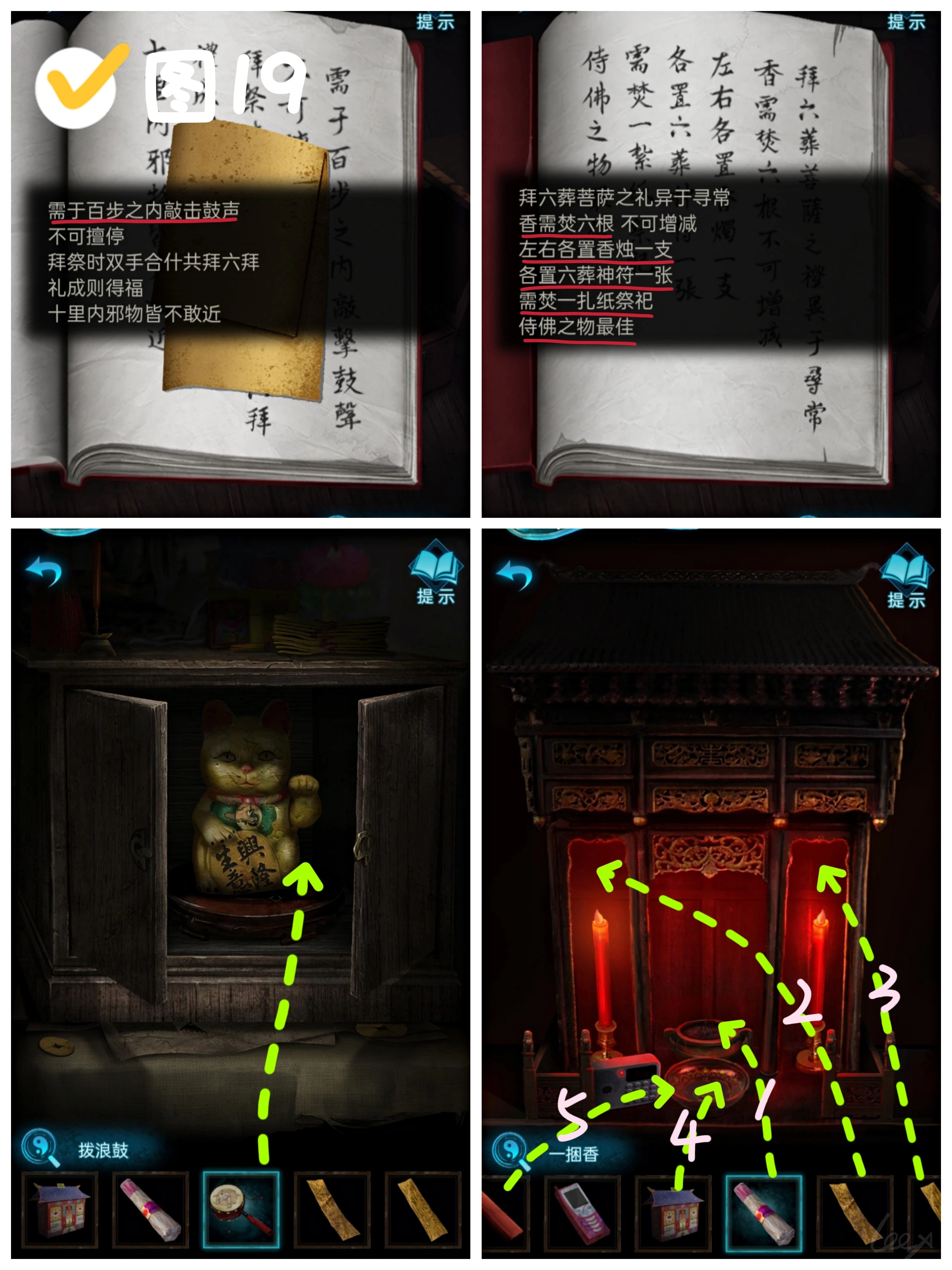 根据婚庆用品店内的红皮书,拜六葬菩萨需焚六根香,左右各设一支香烛与咒符,焚一扎纸,且在百步范围内敲击鼓声。进入易寿堂后,将拨浪鼓放置于上方柜子里的招财猫上。进入六宝阁,点击神龛,把香插入香炉,将两张符咒贴在两侧蜡烛后方,把纸扎寺庙放入盘中,再用打火机点燃(因书中提及侍佛之物以寺庙为最佳,故只需点燃纸扎寺庙即可)。(图19)