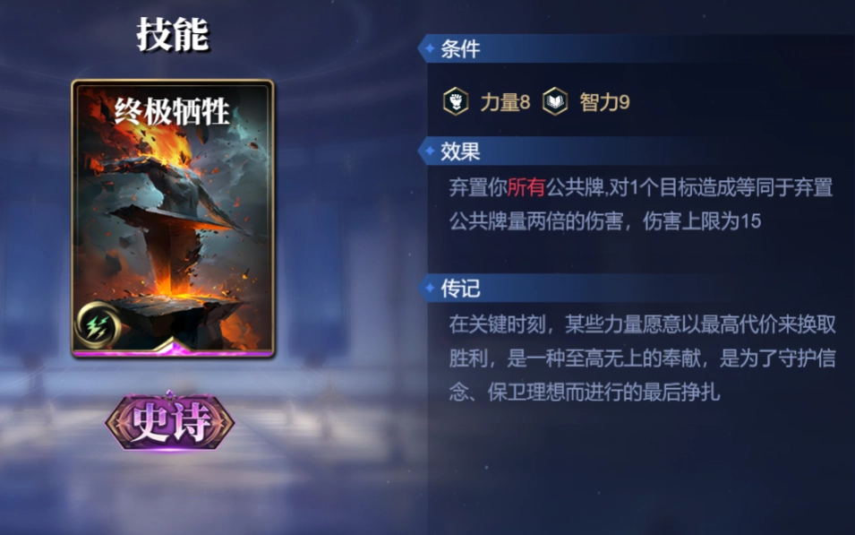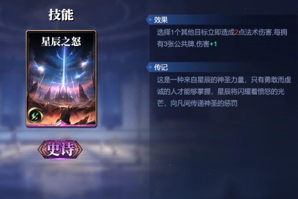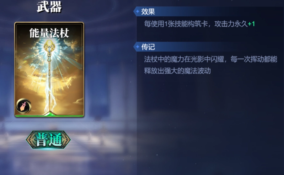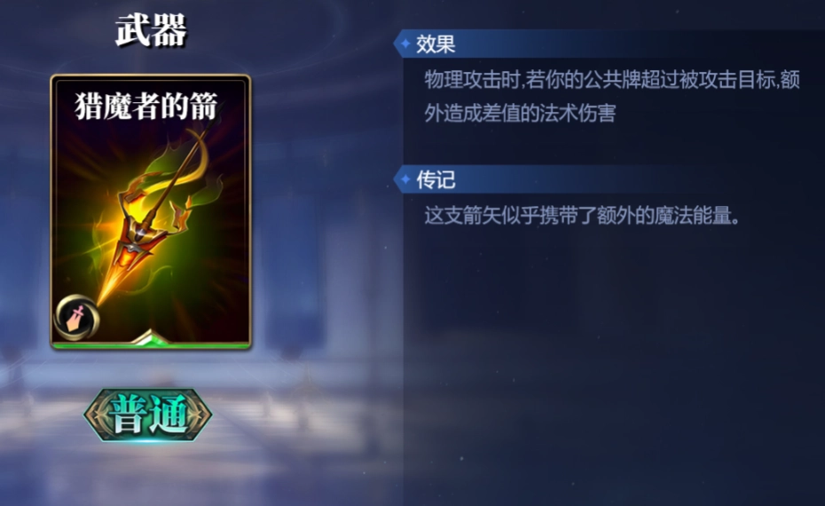 星辰之怒,能即刻对单个目标造成2点法术伤害,每存在3张公共牌,伤害便增加1点。终极牺牲,需弃置全部公共牌,随后对1个目标造成等同于弃置公共牌数量两倍的伤害,不过伤害上限为15。这两张卡牌的特性是手牌越多,伤害越高。搭配【构筑之道】,倘若一回合内触发三次【构筑之道】的过牌效果,这两张卡所能打出的爆发伤害相当可观,其中终极牺牲更可作为最后的斩杀手段。 接着说装备方面,猎魔者的箭能造成与公共牌数量大于对手差值的伤害,与赫拉爆发过牌的能力完美契合。而能量法杖则可使赫拉在使用技能构筑卡时,自身攻击力得以提升。