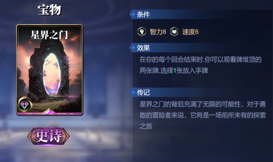 在宝物方面,我们挑选了星界之门。其效果为:当回合结束时,能够查看牌堆顶部的两张牌,并从中挑选一张加入手牌。借助这张卡的效果,既可以操控闪电攻击对方,还能控制对手下一次摸到的牌。