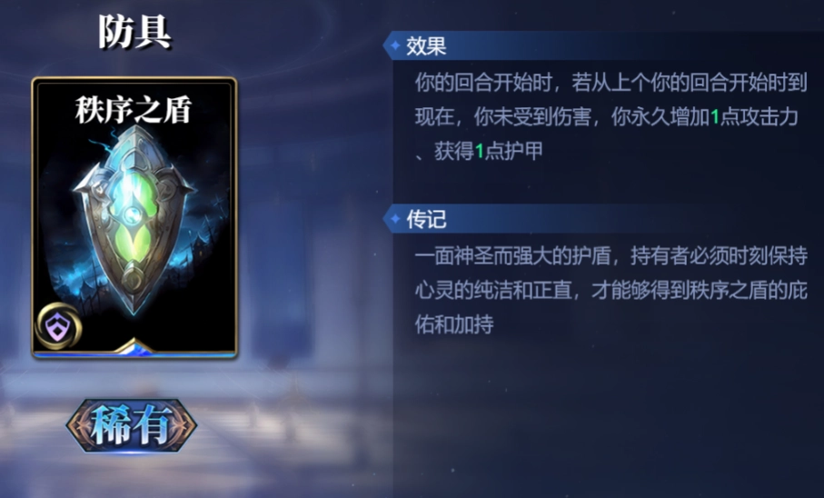 防具方面,建议选择秩序之盾这张装备牌。一旦你装备上它,就能给对手带来进攻压力。要是对方无法对你造成有效伤害,就只能无奈地看着你获取1点攻击力与护甲。