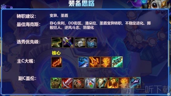 羊刀属于必备装备。不过,要是你的德玛成型速度极快,那么狂徒和饮血在前期也能让德玛充当C位,只是最终可能也只能拿个烂分。要是大嘴很快做出羊刀和巨杀,但德玛最终的装备却很差劲,多数情况下,还不如胡德玛装备时吃分来得稳定。毕竟大嘴基础叠攻速仅0.6,速度非常慢。因此,为保证基础,更建议优先给德玛配备装备。尤其是科技枪搭配大嘴,奶盖伦的效果特别强,巨杀和杀人剑也都适用。正义的伤害比科技枪更优,科技枪则偏向团队功能性,除非是斩杀变异,否则不要上飓风和电刀。