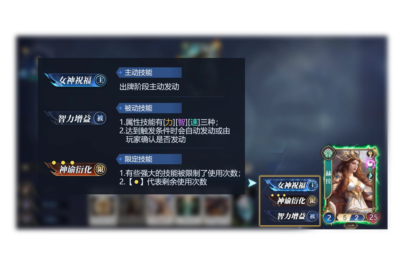 神灵技能分为主动技能、被动技能和限定技能