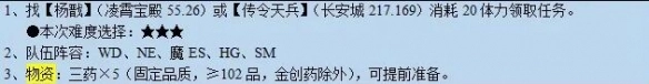 3、物资:三药x5(固定品质,≥102品,金创药除外),可提前准备。