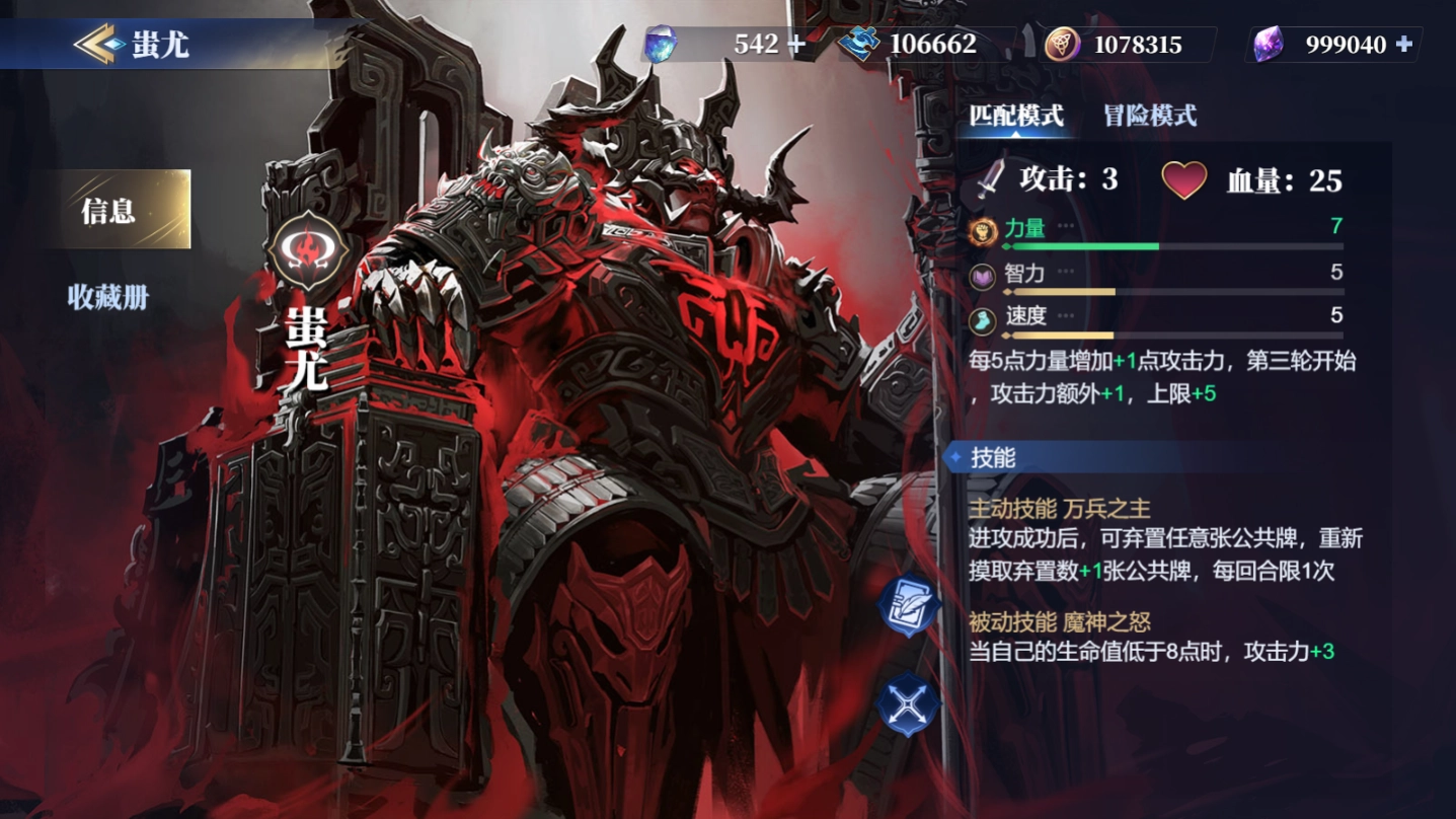 蚩尤,初始攻击力3点,25血量,力智速初始三维为7/5/5