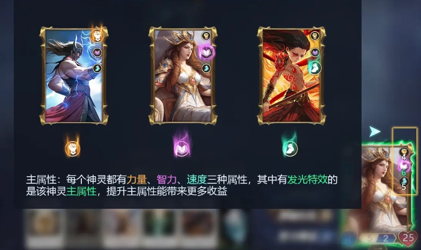 依据主属性,神灵能够获取对应的【属性增益】技能,三种属性的增益方向各有差异。力量增益可提高神灵的攻击力;智力增益能增强神灵的法术输出;速度增益则可以让神灵摸更多的牌。当游戏进展到第三回合时,这些属性增益技能会得到进一步强化,从而加快游戏节奏。