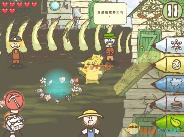 4、随后,你会瞧见旁边有石头,拿起锄头将其敲碎,接着走到羽毛之上。此时,之前你所画鸟蛋孵出的小鸟便会飞过来,带你向上而去。