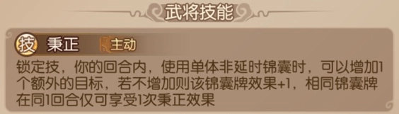 技能:秉正——此为锁定技。在你的回合当中,当使用单体非延时锦囊时,你能够额外增加1个目标。倘若你选择不增加额外目标,那么该锦囊牌的效果将会 +1 。需要注意的是,相同的锦囊牌在同一回合内仅能享受1次秉正效果。