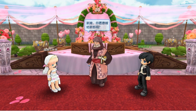 结婚仪式正式开始后,会播放仪式动画。婚礼神父会询问结婚的双方,在得到肯定的“我愿意”之后,双方正式结为夫妻。