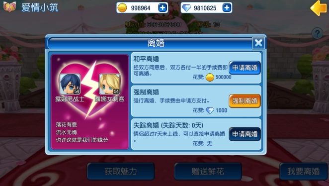 当然,若夫妻感情破裂、缘分终结,玩家双方能够申请离婚,也可耗费钻石强制离婚。要是伴侣连续7天未上线,玩家则可免费申请离婚。