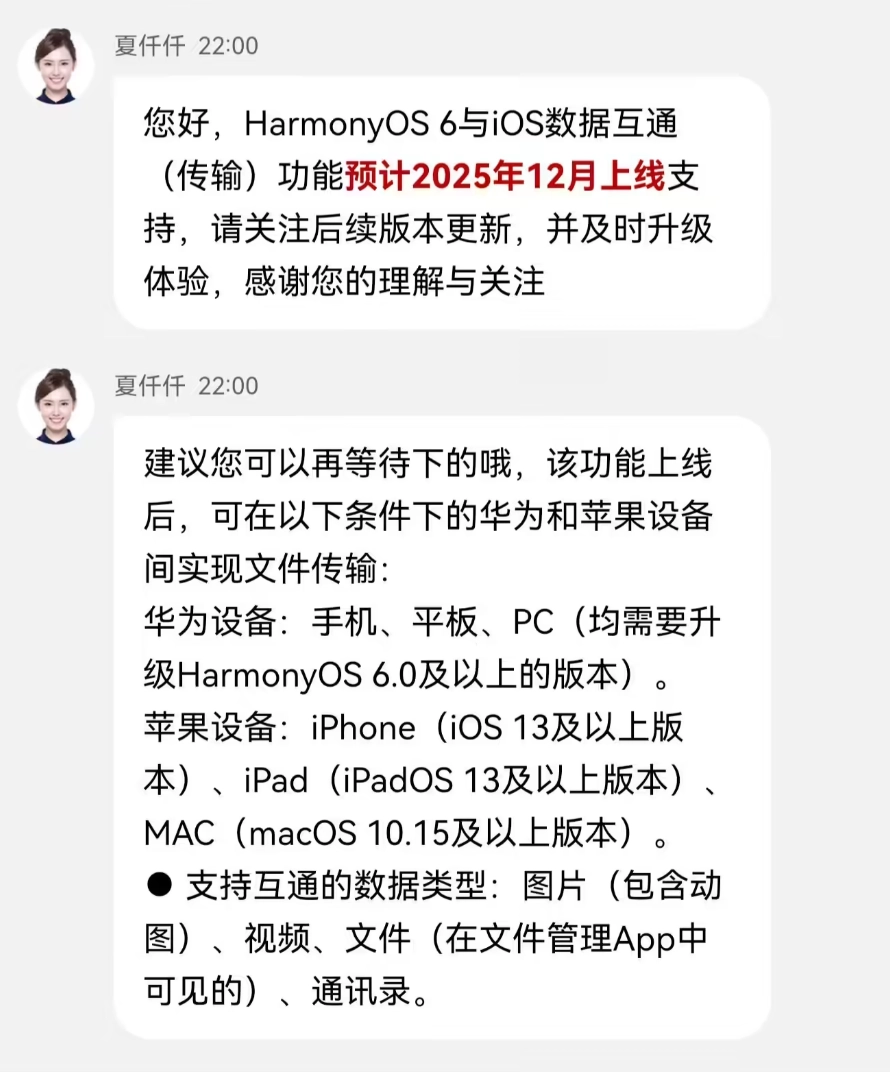 据华为官方客服透露,HarmonyOS 6与iOS之间的数据互通功能,预计会在2025年12月正式推出。值得一提的是,这并非仅满足基础传输需求的简单功能,而是在细节打磨上颇为用心。