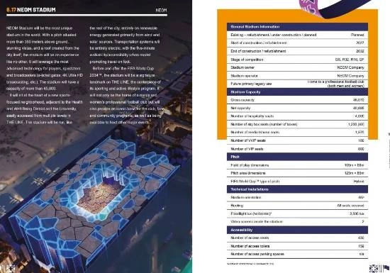 在沙特2034年世界杯的申办计划书中提到:“这座球场将建在地面以上350多米的高度……体育场的容纳人数将突破45000人。和新未来城的其他区域一致,该球场将完全依托风能与太阳能转化的可再生能源运作。交通体系会全面采用电动化模式,与此同时,还将借助步行5分钟可达的城市模型,鼓励人们选择步行出行。”