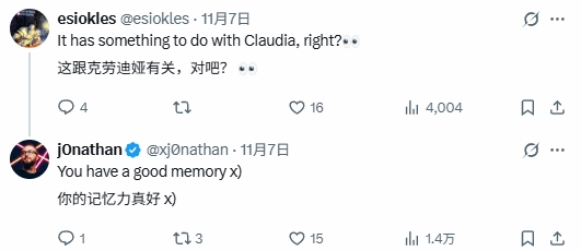 据了解,@xj0nathan在这一则贴中回应了“是否与克劳迪娅(艾吉奥的妹妹)有关”的问题,他表示:“你的记忆力很好。”
