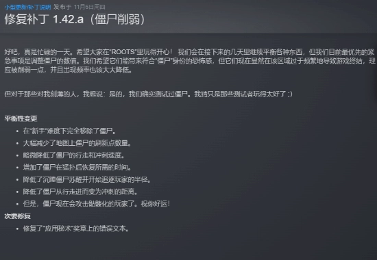 根据外媒gamesradar报道,在最新发布的一段视频里,游戏开发商透露:“我们对这些僵尸进行了小幅削弱,原因是有玩家反馈它们的强度过高。不过也有部分玩家认为它们的强度仍显不足,因此我们正致力于找到一个合适的平衡点。请大家放心,这些僵尸依旧会给玩家带来不小的挑战,但我们已将其强度调整到足以让大家享受游戏乐趣的程度。”