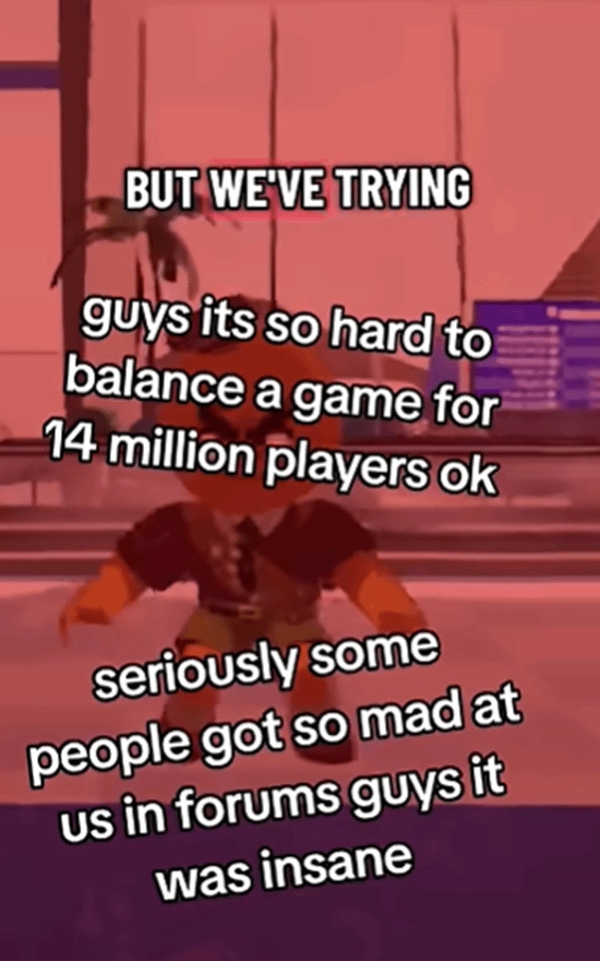 视频里还出现了一行字幕,开发商抱怨道:“朋友们,要平衡一款拥有1400万玩家的游戏实在是太难了。说真的,有些玩家在论坛上对我们怒气冲冲,那场面简直太夸张了。”