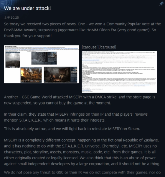 近日,推特用户@Pirat_Nation发布消息称,《潜行者2:切尔诺贝利之心》的发行商GSC Game World被曝向Steam施压,要求下架一款名为《MISERY》的游戏。目前,这款游戏的商店页面已无法访问。
