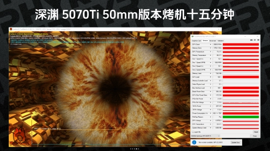 在相同环境温度条件下,对两款设备进行50分钟的烤机测试后发现,50mm版本的核心温度与显存温度均比另一版本高出约6度。