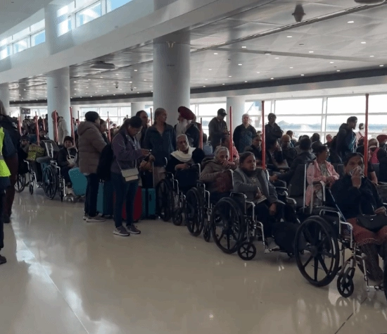 近日,有网友发布的视频显示,在美国飞往印度的国际航班登机口,有不少乘客坐着轮椅排队等候登机。