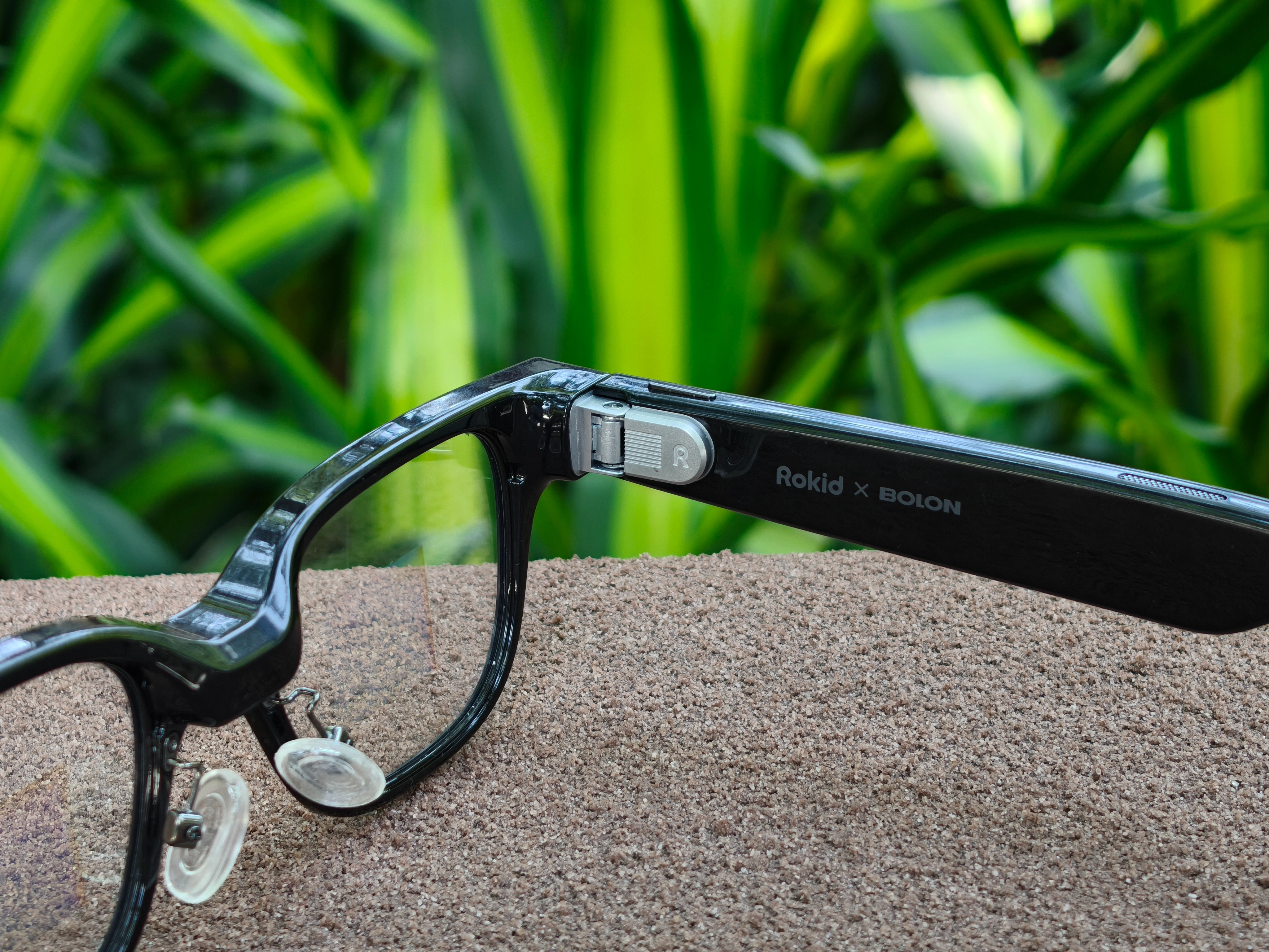 BOLON AI 智能眼镜从造型上就更走「时尚」路线,基于经典的 D 型镜框设计,镜框线条和常规日常镜架更接近,同时做到了单框只有 38.5 克,鼻托、转轴这些细节也按照亚洲脸型重新打磨。