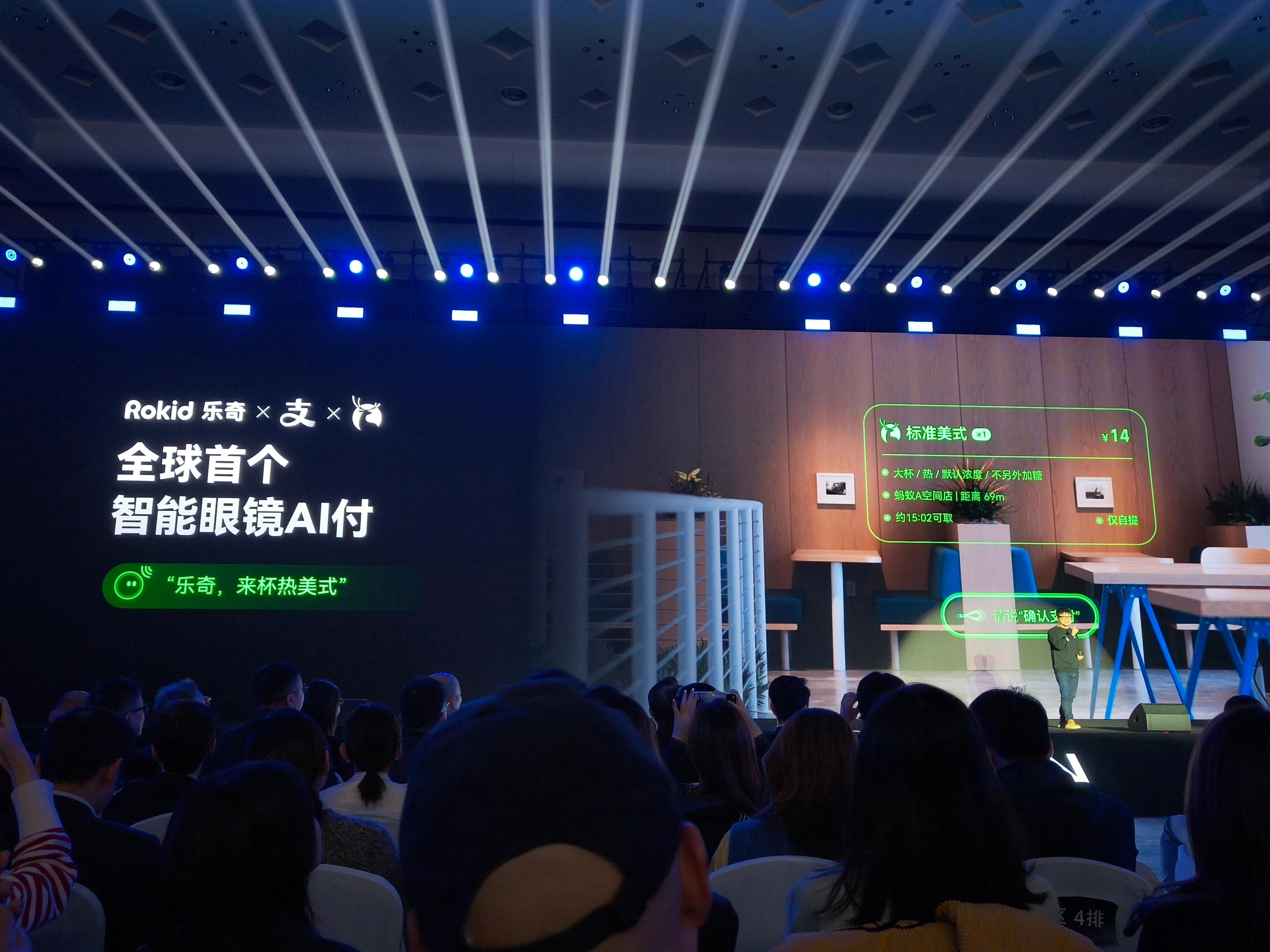 在发布会开始之前,影视飓风的Tim在现场借助眼镜为观众点了五百杯瑞幸咖啡。这次点单并非采用大家熟悉的“扫码”方式,而是运用了与支付宝、瑞幸合作推出的“AI付”功能——依靠语音交互以及眼镜视野捕捉到的信息,就能完成点单和支付的全流程,让眼镜成为一个可以实现完整消费闭环的终端设备。