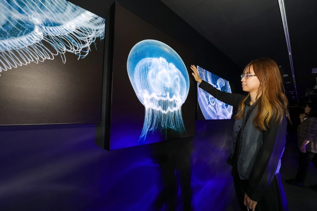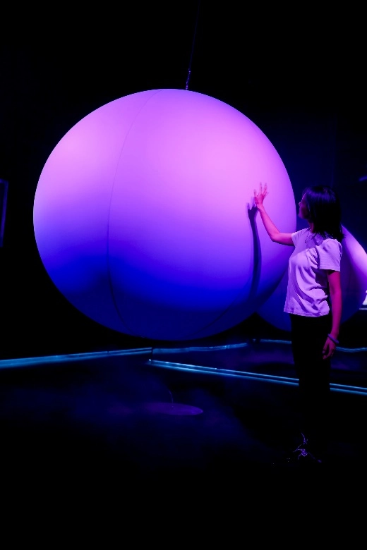 整个展览规划了三层核心展区。一层打造影像艺术互动空间,以光影与影像的融合设计,赋予影像作品灵动质感与震撼的视觉表现力。二层设置“文化遗产石窟”与“深海秘境”两大沉浸式体验板块:“文化遗产石窟”展区采用纸艺工艺复原石窟场景,搭配唐代鎏金铁芯铜龙、商代戴金面罩青铜人头像等文物摄影作品的投影展示,让参观者在虚实交织中开启跨越时空的文化对话;“深海秘境”体验区则借助光影技术营造沉浸式氛围,使观众仿佛潜入神秘海底,与水下生物展开近距离互动。四层的展览内容更为多元丰富:实景搭建的艺术花园景致绚丽,成为参观者热衷打卡的梦幻布景;多面镜射构建的深空场景与沉浸式投影打造的极光海滩,让观众沉浸于“星穹咏叹”的视觉盛宴;展区还呈现了由大气尘埃粒子反散射形成的淡粉色光弧——这一被称为“维纳斯带”的反曙暮光现象,其旁灰蓝色的条带正是地球的影子。展区采用的气膜材质,灵感源自观测时感知到的“天空的呼吸”,将无形的空气转化为可触摸的实体形态,观众眼中所见不仅是“固体结构”,更似空气在光影中显影的动态过程,生动诠释了维纳斯带“轻盈、流动、随时间消散”的生命特质。而展区内的球体装置仿佛在同步呼吸,呼应着人类与大气之间最本源的联结,为每一位到场观众带来一场真实可感的天文奇观体验。