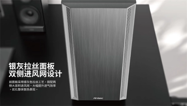 这款机箱的前面板运用了银灰色拉丝工艺,两侧配备了长条形的进风网孔,在美观性、散热效果以及低噪音运行这几方面都能兼顾到。