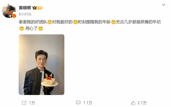 黄晓明风趣地向团队致谢:“感谢我的优秀团队[微笑]对我真不错[微笑]总不忘提示我的岁数[微笑]不管多大都是奋斗的时光[微笑] 费心了[微笑] ”