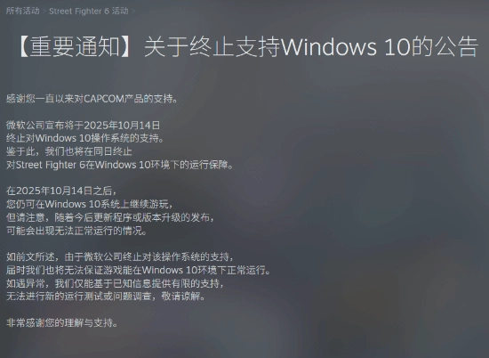 今日,卡普空发布公告,宣布将终止对《街头霸王6》Windows 10版本的支持。