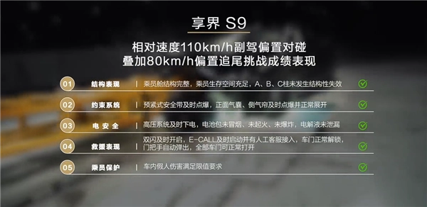 作为9系旗舰车型,安全性能无疑是它最核心的优势所在。S9采用了六横八纵的车身结构设计,同时配备9安全气囊以及7重安全冗余系统,并且顺利通过了相对速度110km/h的副驾偏置对碰与80km/h偏置追尾相结合的严苛测试挑战。