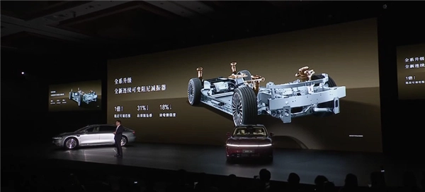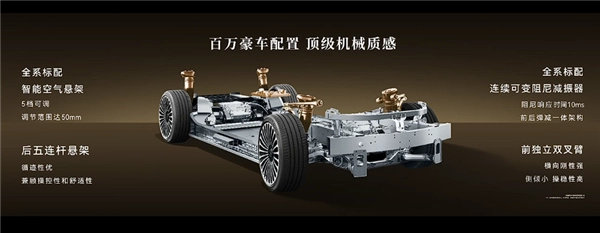 在底盘架构方面,新款S9已升级至全新的途灵平台,其悬架系统采用前双叉臂与后五连杆独立悬架的组合,并且全系车型都标配了连续可变阻尼减振器以及智能空气悬架——该空气悬架支持5档高度调节,调节范围可达50mm。