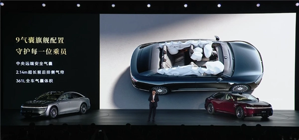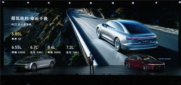 这款车的定位是中大型行政轿车,其长宽高尺寸为3050*2005*1492mm,轴距达到5160mm。作为量产豪华轿车,它拥有最低的风阻系数0.193,正是凭借这一优势,S9纯电版的最远续航里程可达816公里,而四驱版的续航里程则为721公里。