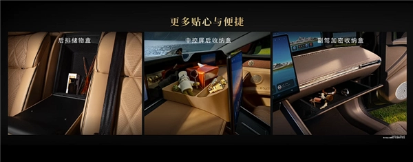 内饰也同步采用了S9T的设计风格进行焕新,配备了12.3英寸的全液晶仪表、16.1英寸的中控触控屏以及12.3英寸的副驾娱乐屏。车内采用了全车Nappa真皮包裹,并搭配进口实木饰板,营造出更具质感的驾乘氛围。此外,全系车型还标配了车载冰箱,并且支持四座的通风、加热以及按摩功能,进一步提升了乘坐的舒适性与豪华感。