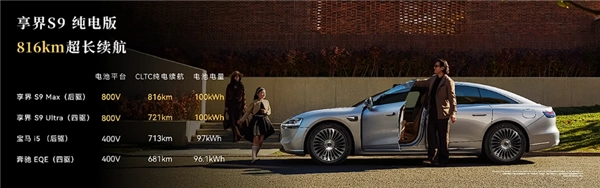 纯电版基于800V高压平台打造,提供后驱和四驱两种版本,标配宁德时代100度三元锂电池,CLTC工况续航816km和721km。