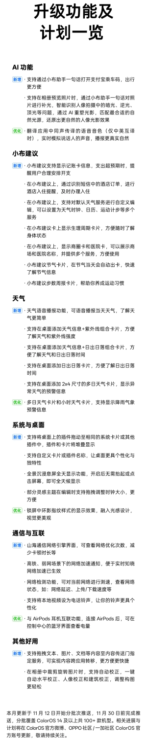 同时,基础体验也进行了全面优化:唤醒小布后,只需一句话就能开启AI人像补光功能,让拍照补光变得更加便捷;卡片堆叠功能现已扩展到第三方插件,桌面布局因此更显简洁高效;小布建议的健康板块新增了“生理周期卡”和“医院服务卡”,健康管理服务更为贴心;相册中内置了AI图像校正功能,拍摄失误的照片可以一键优化;视频来电铃声、天气卡片也新增了日出日落时间显示、紫外线及降雨提醒等功能,让手机使用更贴合日常生活场景。