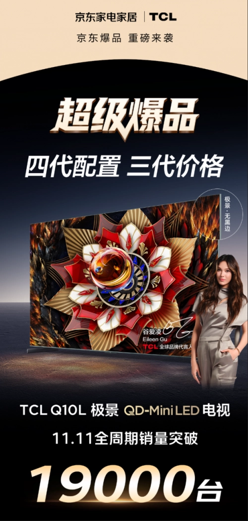 在不断促进行业标准迭代与应用场景革新的过程中,京东进一步发挥“超级供应链”在效率与品质上的优势,与品牌方加强产品层面的深度合作,通过“独家包销”的模式打造具备强劲市场潜力的“超级爆品”。在11.11活动期间,京东和TCL共同推广的TCL Q10L全面屏无黑边电视,便是这一合作策略下的突出成果。这款产品凭借“四代旗舰级配置、三代亲民价格”,达成了性能与价格的双重超越,全周期销量超过19000台,在销售高峰期更是有超3800位用户集中下单,好评率达到100%,有力地证明了市场对京东力推高端产品的广泛认可。