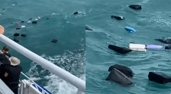 当时,这群外国游客正从泰国龟岛搭乘渡轮前往苏美岛,不少乘客把相关视频分享到了社交平台。有一段视频里,乘客们站在甲板上,远远望着那些在水面上随波漂浮的行李箱;另一段视频中,待在客舱里的人们则一脸错愕,齐齐盯着窗外漂流的一件件行李物品。