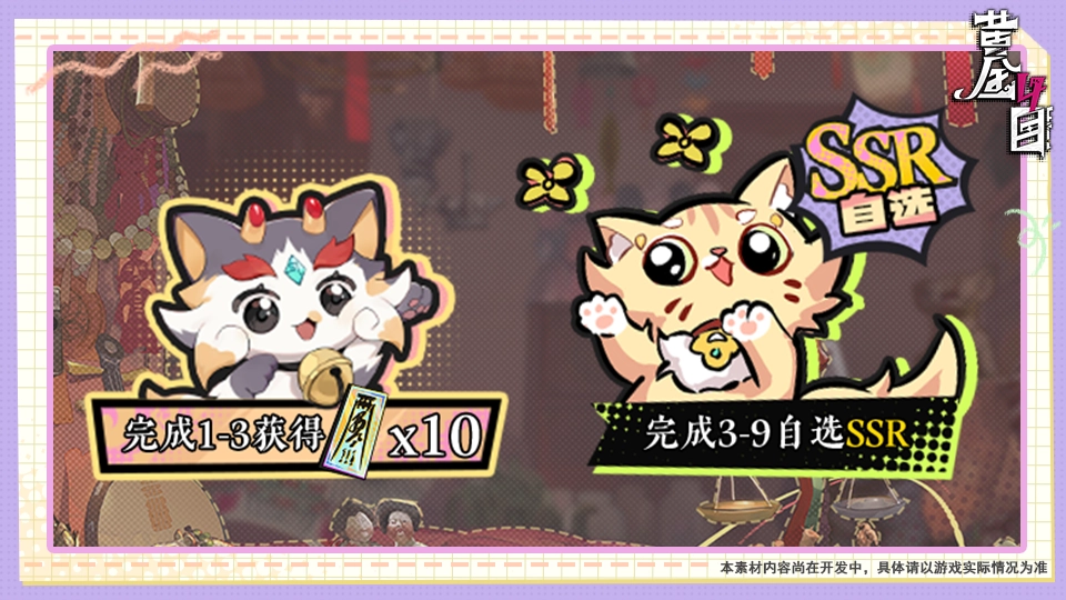 只需通关主线【第一章:半窟鬼茶肆】的前3关!就能拿到【祈神符箓·逸*10】喵!另外,当完成主线【第三章:芦苇之中】后,还能免费招募一名【SSR傩神】(四选一)喵!赶紧去扫除祸祟吧!